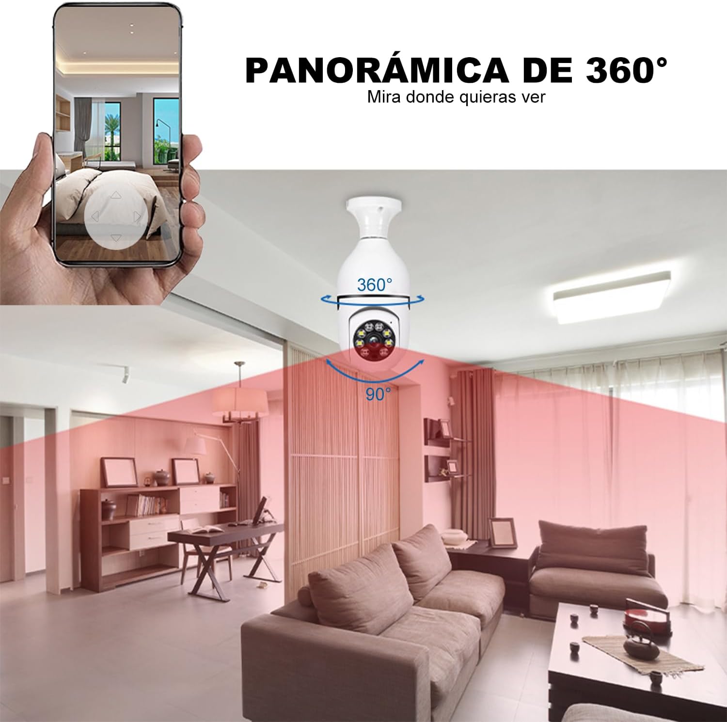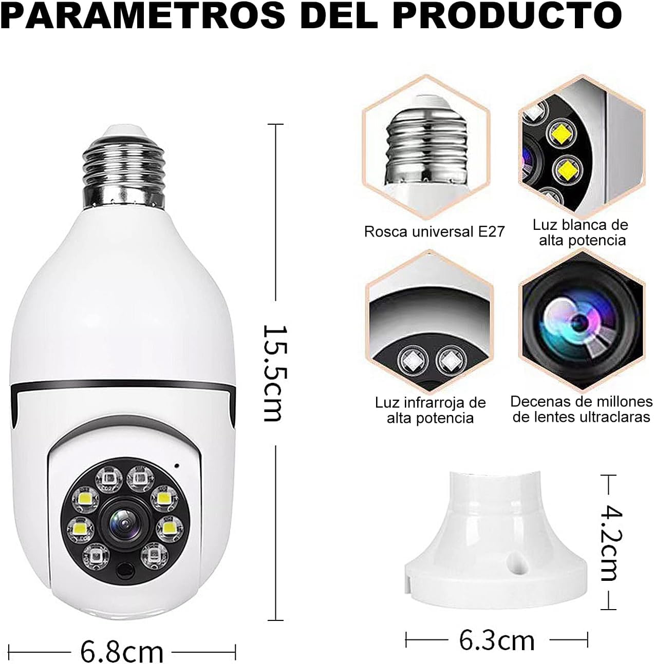Cámara de seguridad, se puede instalar usando una base de bombilla E27 normal (110 V ~ 240 V), es tan fácil de instalar como una bombilla, que admite grabación continua las 24 horas, los 7 días de la semana y sobrescribirá automáticamente una vez que la tarjeta SD está lleno (este paquete no incluye tarjeta SD, MAX 128GB) Y admite WiFi 2.4G, NO funciona con WiFi 5G.