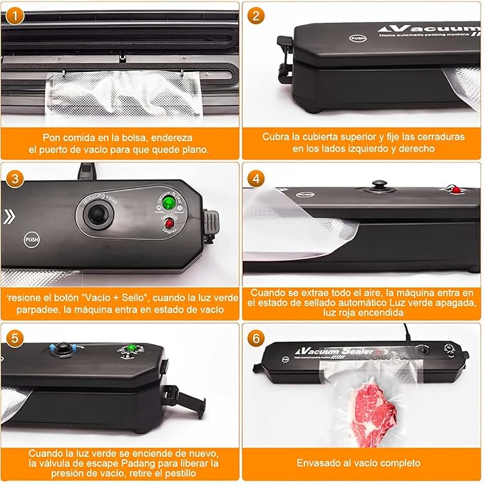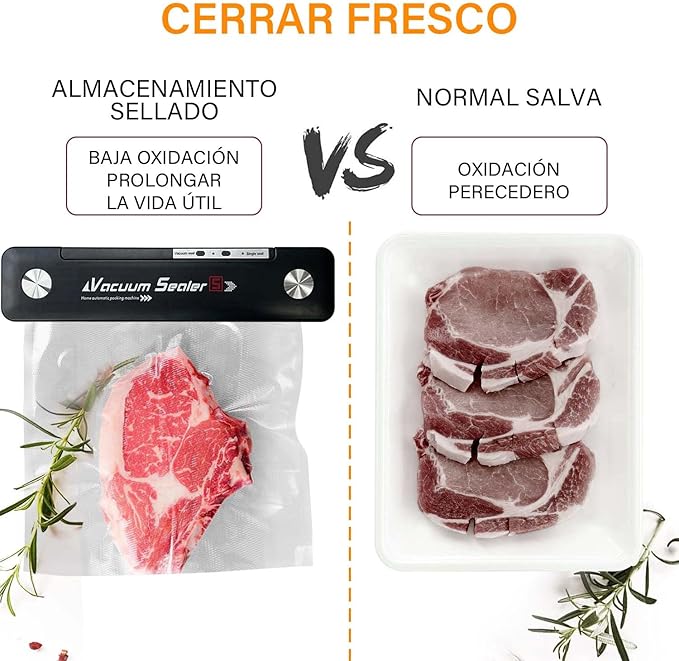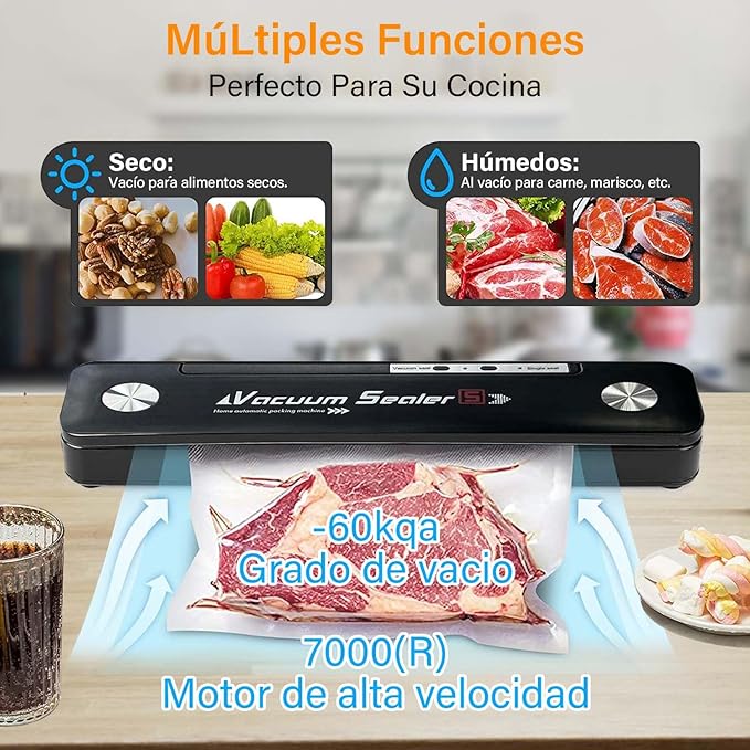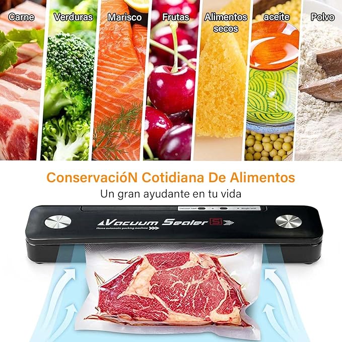 Selladora al vacío diseñada para conservar alimentos por más tiempo mediante extracción de aire, ayudando a mantener frescura y sabor. Es compacta, fácil de usar y compatible con bolsas incluidas. Funciona en 110/220V y es ideal para reducir desperdicios y organizar alimentos en casa.